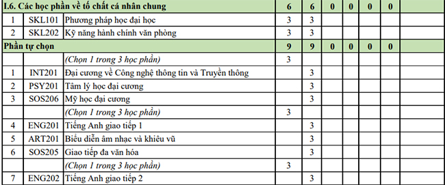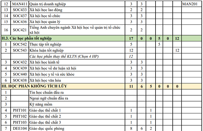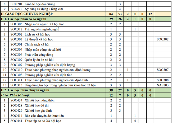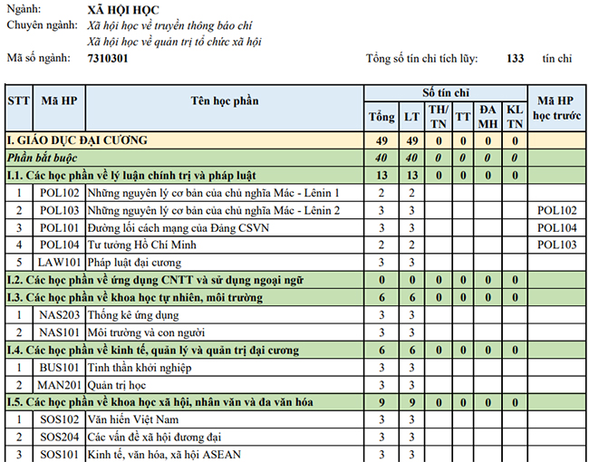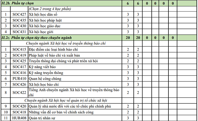 BẢNG CHI TIẾT MÔN HỌC NGÀNH XÃ HỘI HỌC